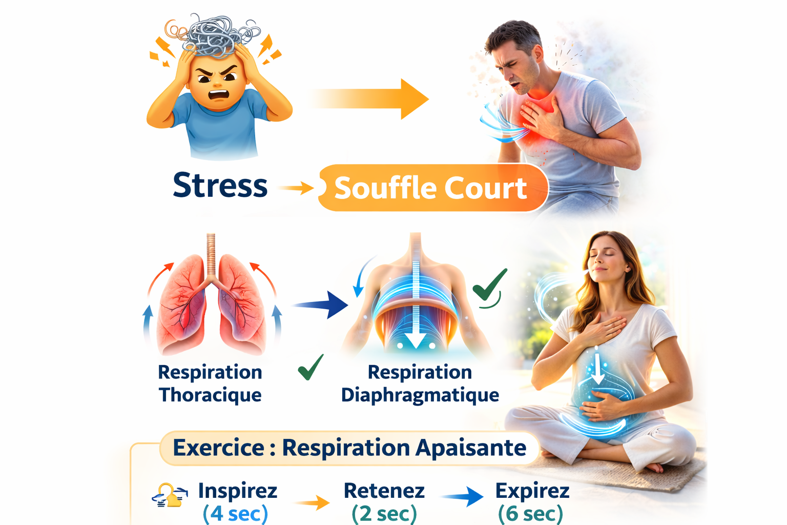 Sous l’effet du stress, la respiration remonte vers le haut. Elle devient thoracique : les muscles entre les côtes, le haut de la poitrine, et même le cou commencent à travailler.
