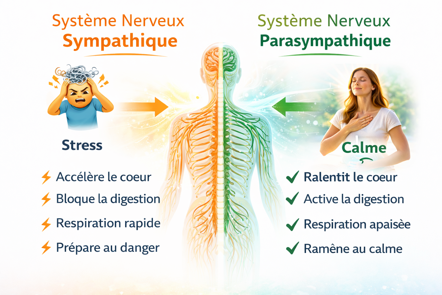 Pourquoi une expiration plus longue ? Parce que c’est l’expiration qui active le système parasympathique — le mode « repos et récupération » du corps.